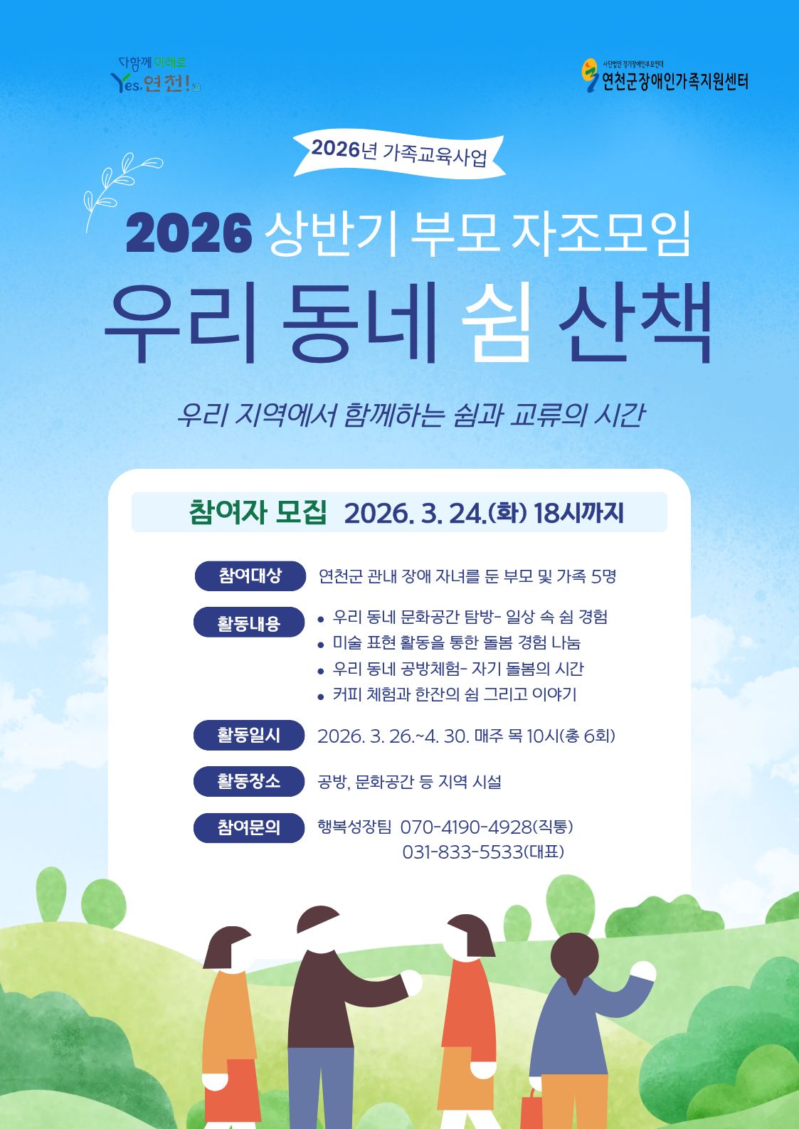 우리 연천군장애인가족지원센터에서는 장애인가족교육사업의 일환으로 장애인 자녀 양육의 스트레스 해소 및 유대감 강화를 위하여 2024년 하반기 부모 자조모…